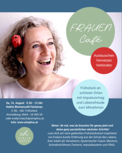 Bring deine Freundinnen, Mama, Tochter, Kollegin … mit und setz dich zu uns. Wir frühstücken gemeinsam, lernen uns kennen, unterhalten uns und tauschen uns aus. Wie alt du bist oder welchen Beruf du hast etc. spielt hier keine Rolle. Jede ist willkommen! Nachdem wir alle frisch gestärkt sind vom bunten Frühstück, erwartet dich eine halbe Stunde Impulsvortrag von Evelyn zu einem interessanten Thema. Mitreden, Mitdenken und Mitlachen ist ausdrücklich erwünscht. Alles kann, nichts muss.